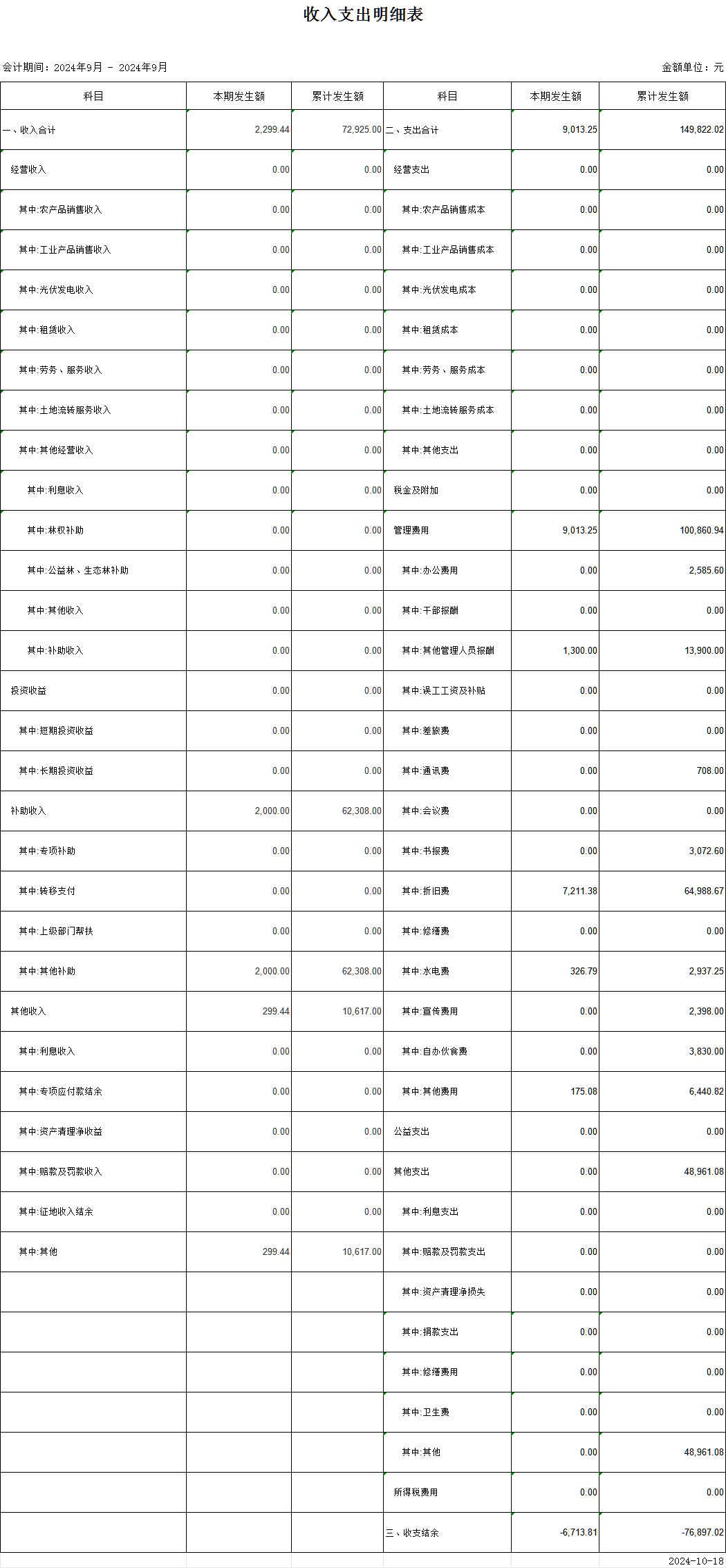 白田埠村2024年9月財(cái)務(wù)收支情況公示