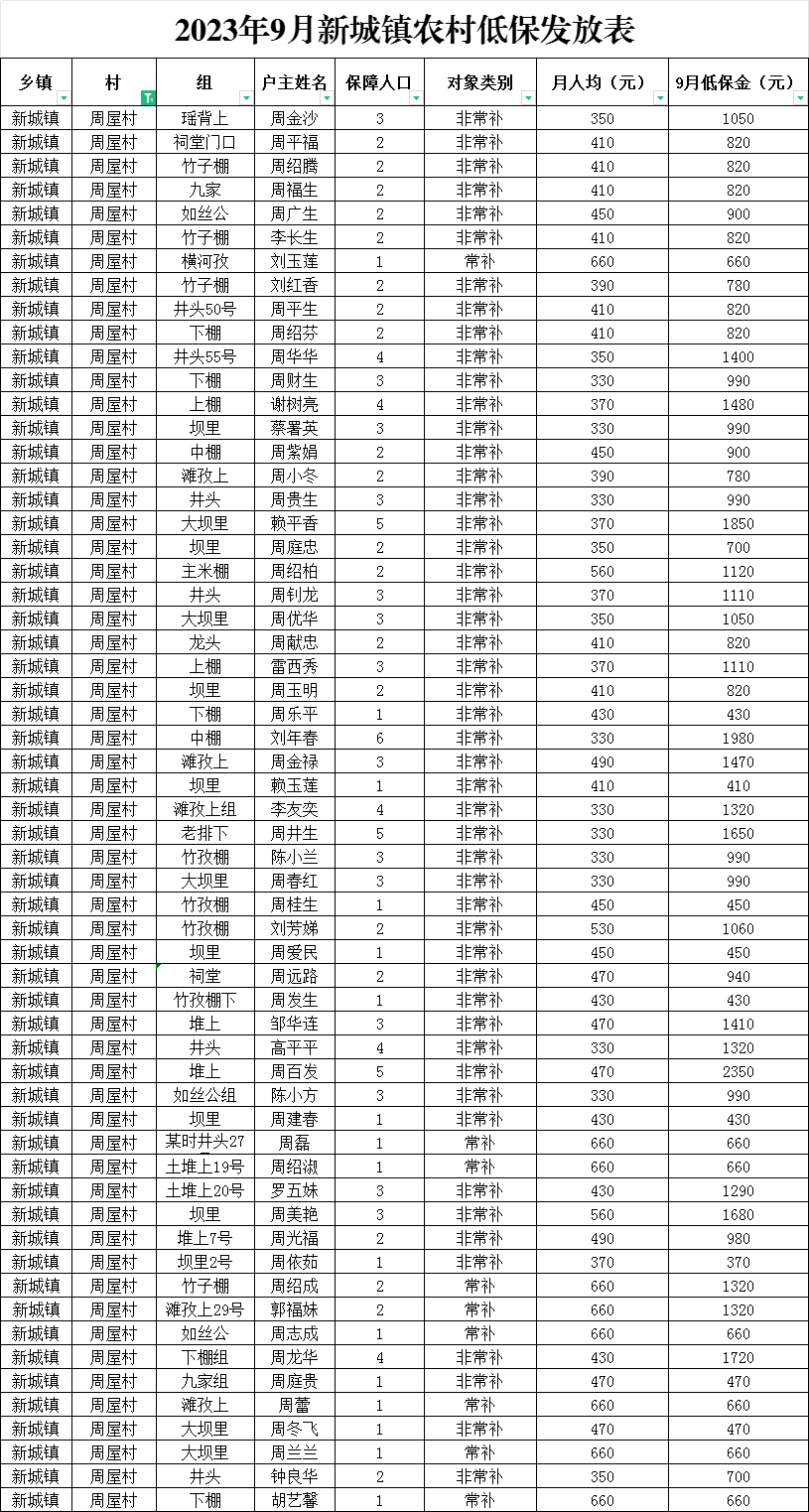 新城鎮周屋村2023年9月農村低保發放公示
