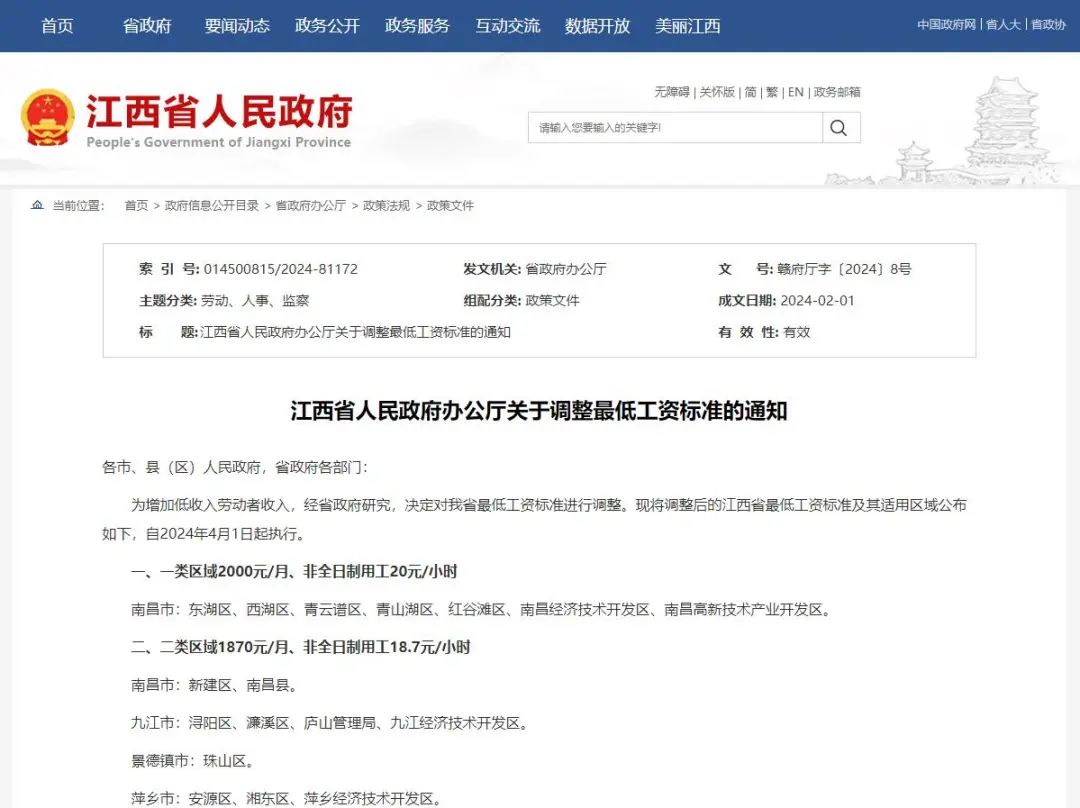 為增加低收入勞動者收入,經省政府研究,決定對我省最低工資標準進行調整。現將調整后的江西省最低工資標準及其適用區域公布如下,自2024年4月1日起執行。