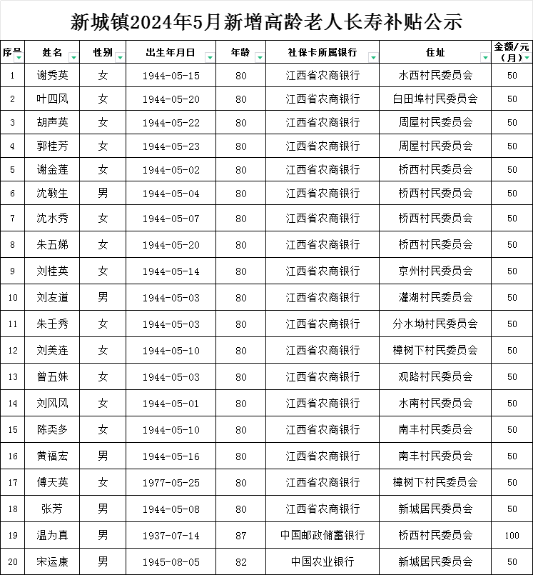 新城鎮2024年5月新增高齡老人長壽補貼公示