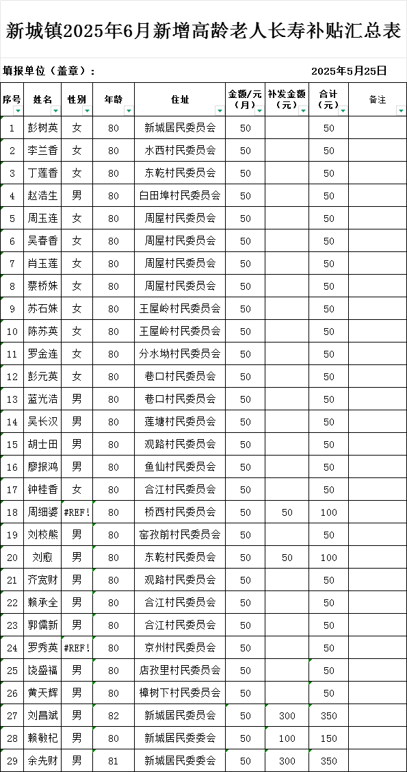 新城鎮2025年6月新增高齡老人長壽補貼匯總表