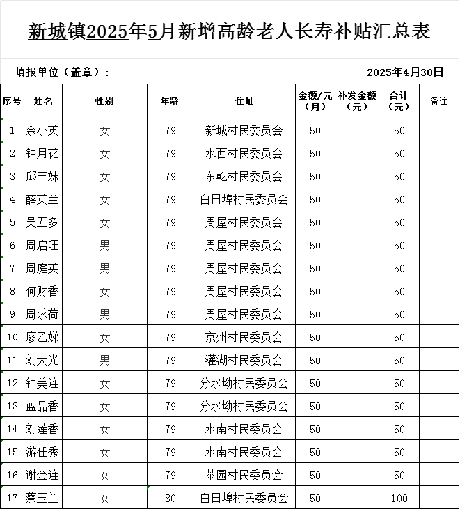 新城鎮2025年5月新增高齡老人長壽補貼匯總表