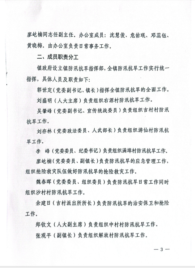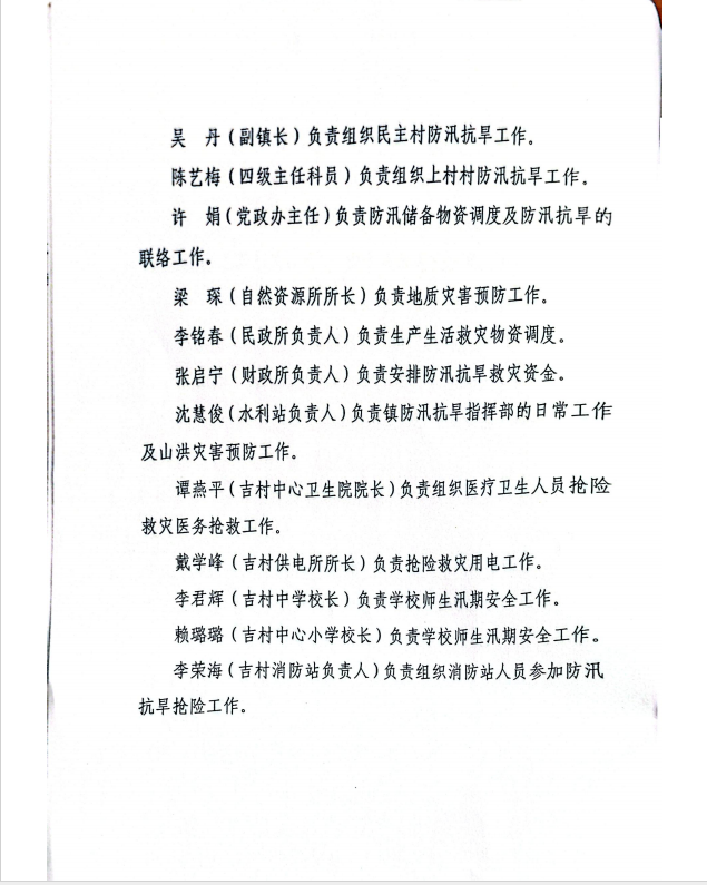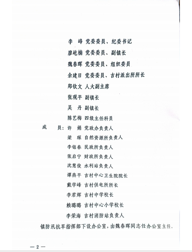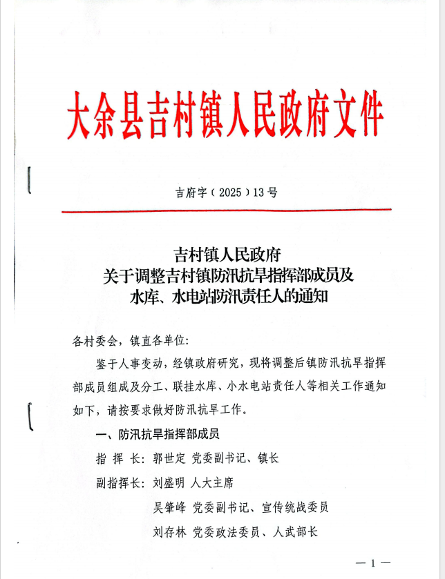 關于調整吉村鎮防汛抗旱指揮部成員及水庫、水電站防汛責任人的通知