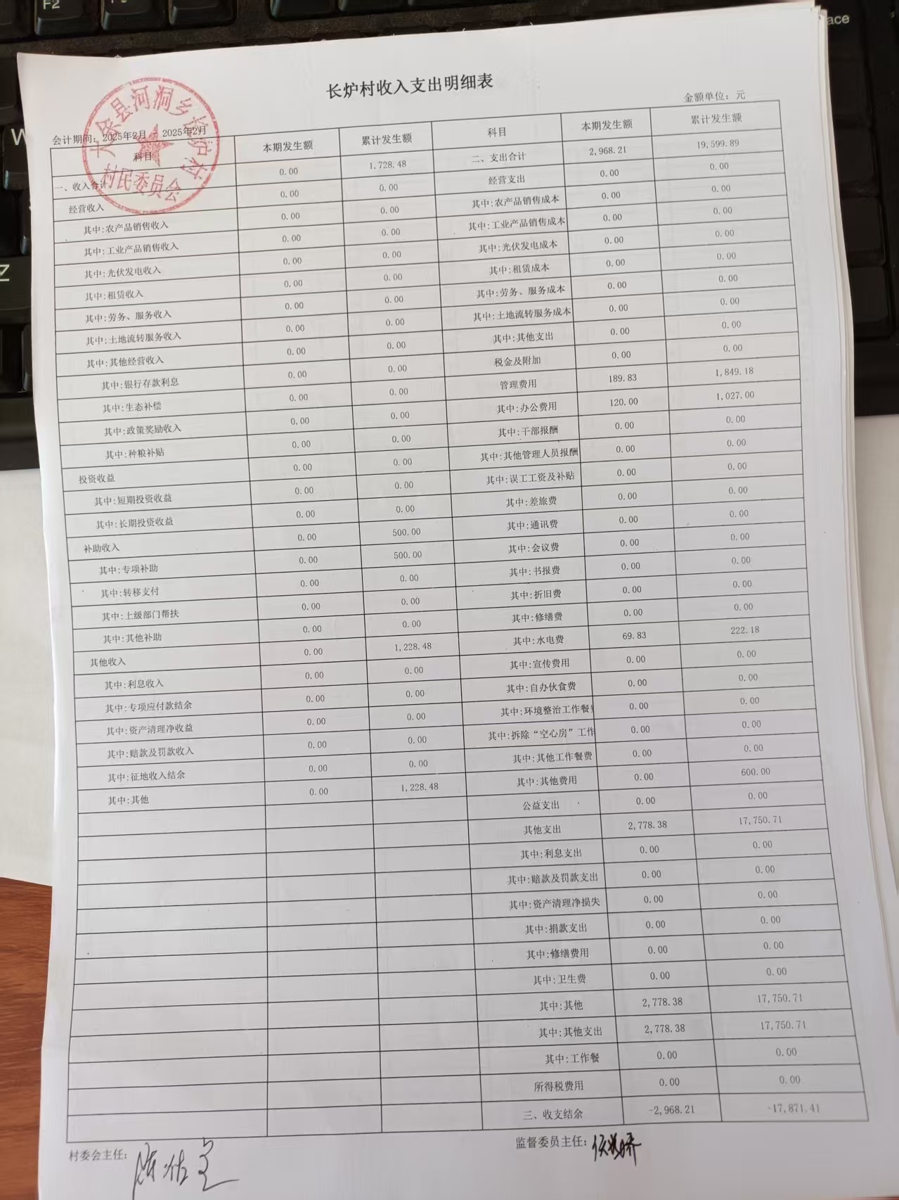 長爐村2月份財務收支明細表