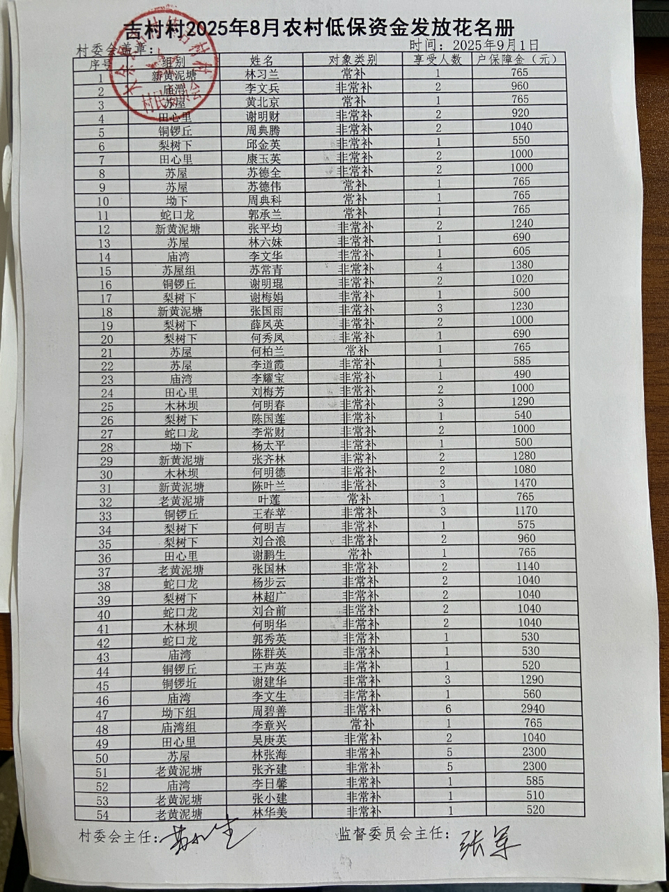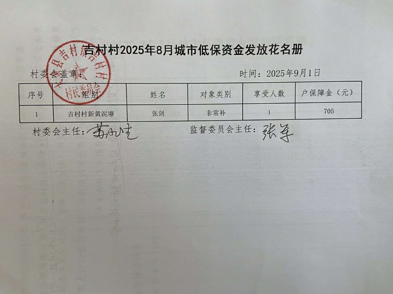 吉村村2025年8月農(nóng)村低保資金發(fā)放花名冊