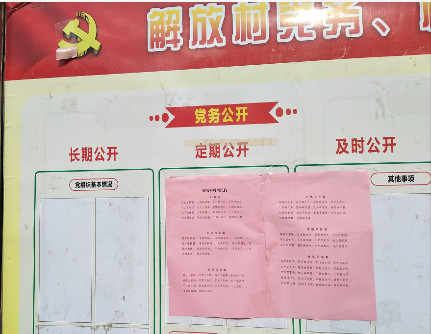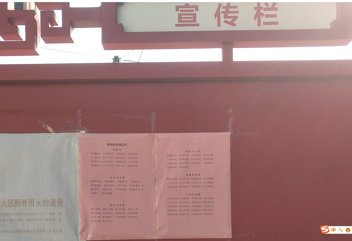 咱們解放村,人好民風淳。立村規民約,正風俗德品。