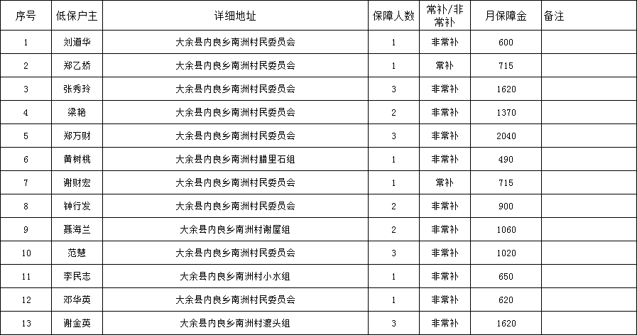 內(nèi)良鄉(xiāng)南洲村2025年1月農(nóng)村最低生活保障資金發(fā)放表