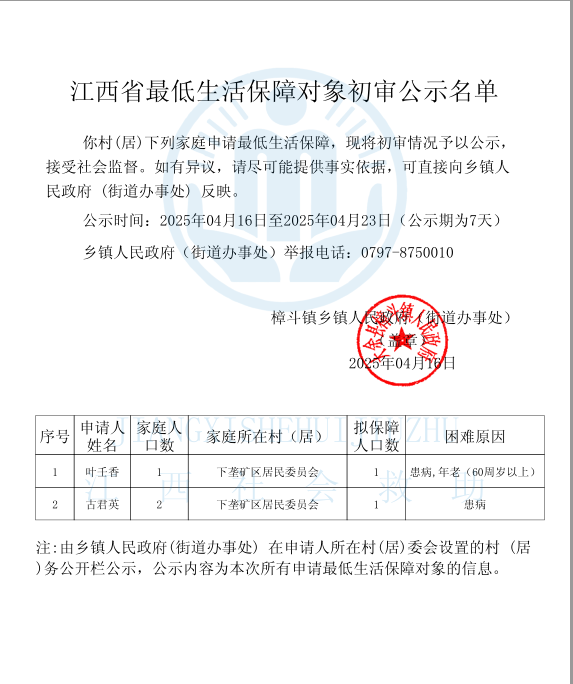 2025年4月下壟社區(qū)新增低保名單公示