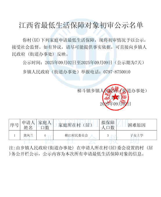 2025年9月橫江村新增低保名單公示