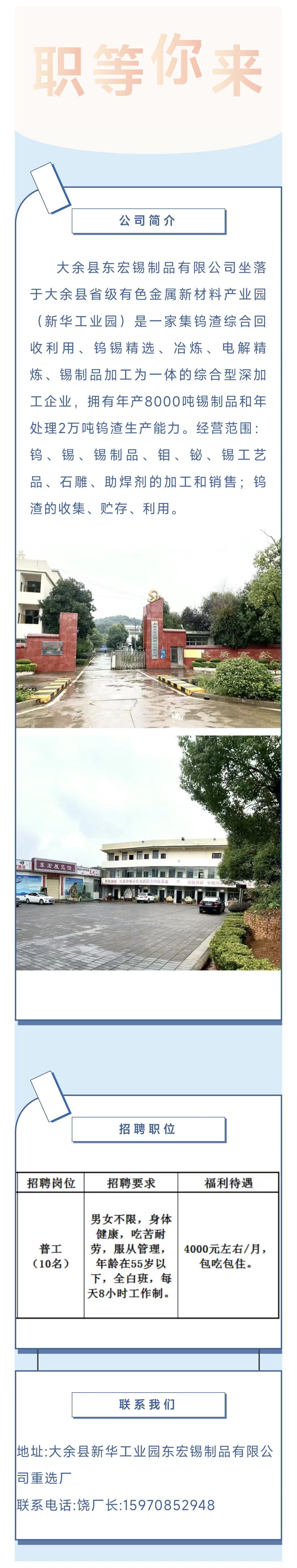 大余縣招聘資訊——大余縣東宏錫制品有限公司