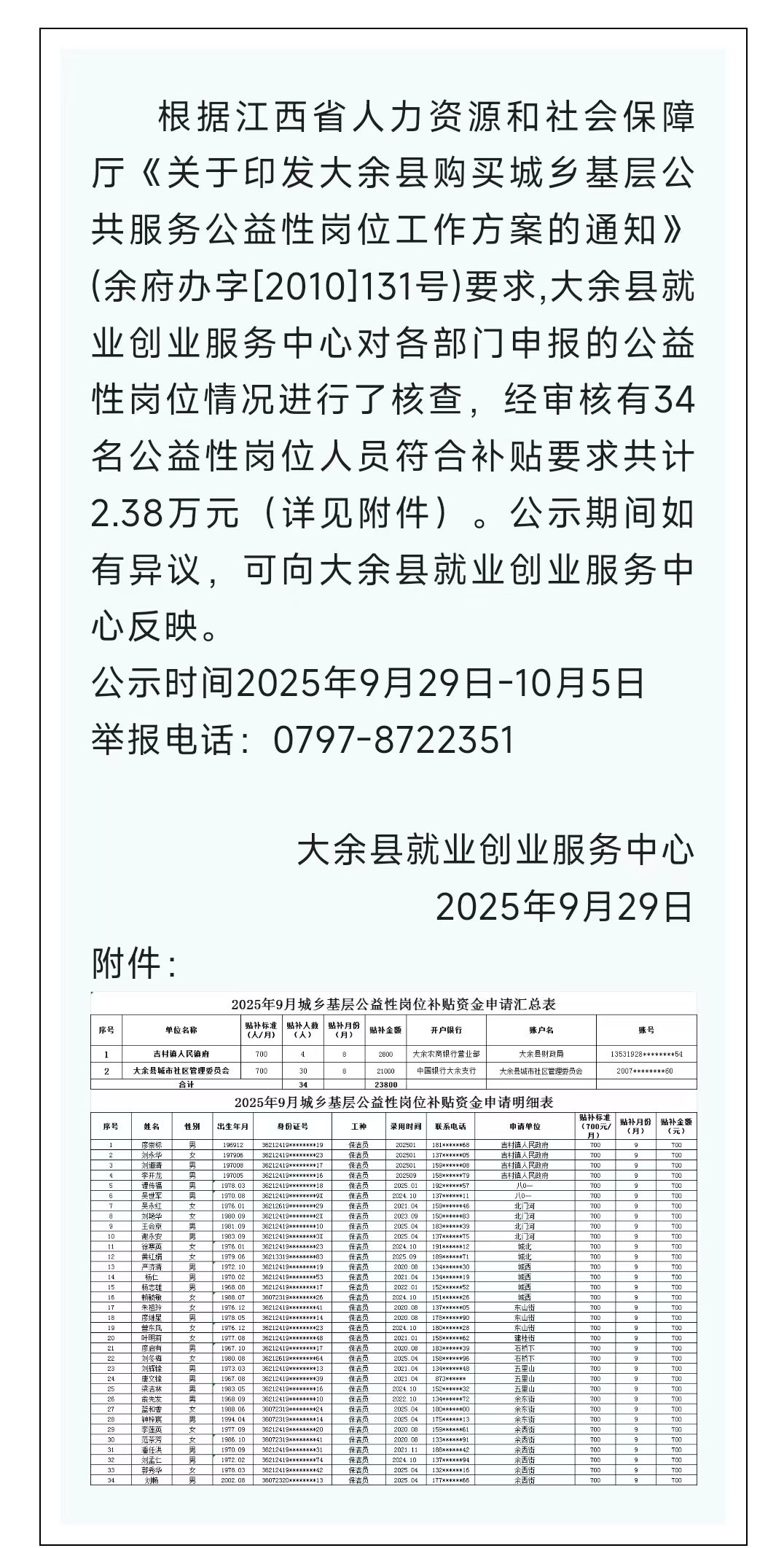 2025年大余縣9月份城鄉(xiāng)基層公益性崗位信息公示