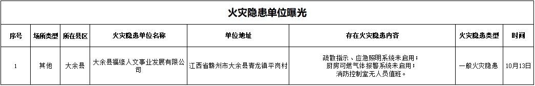 為做好火災防控工作,大余縣消防救援大隊對以下存在火災隱患的單位進行曝光,希望被曝光單位明確細化整改工作責任,認真落實隱患整改計劃,確保隱患如期銷案。