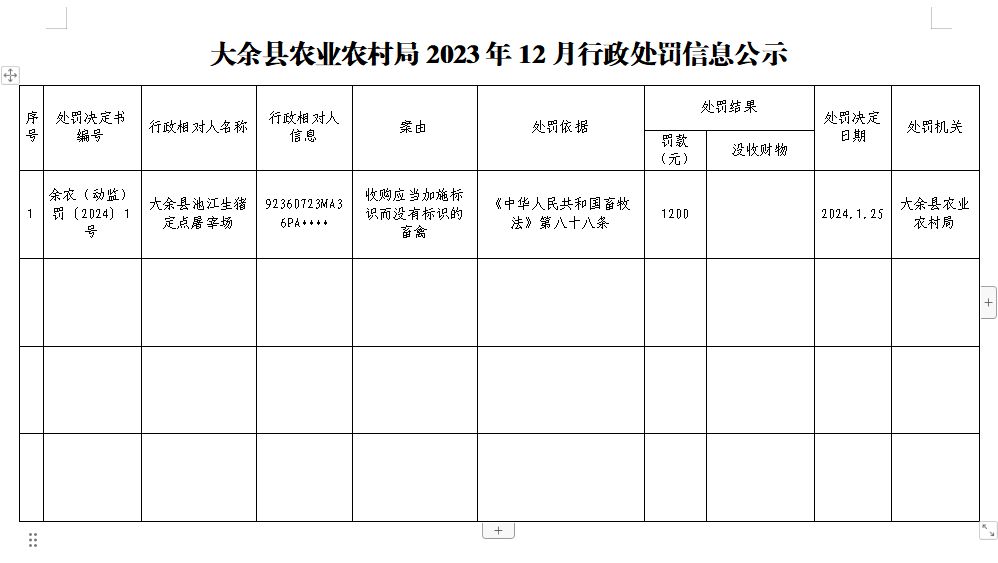 大余縣農(nóng)業(yè)農(nóng)村局2023年12月行政處罰信息公示