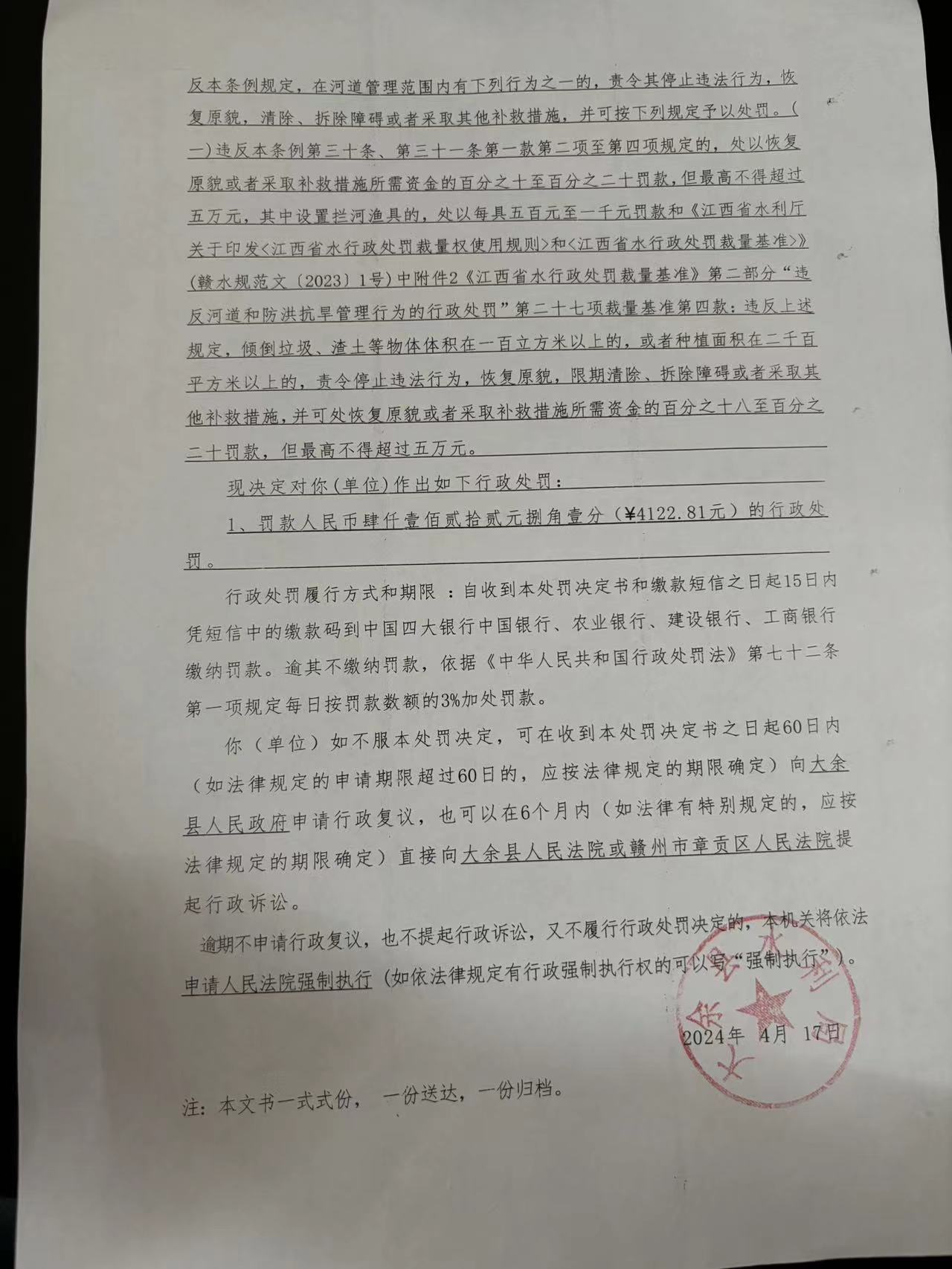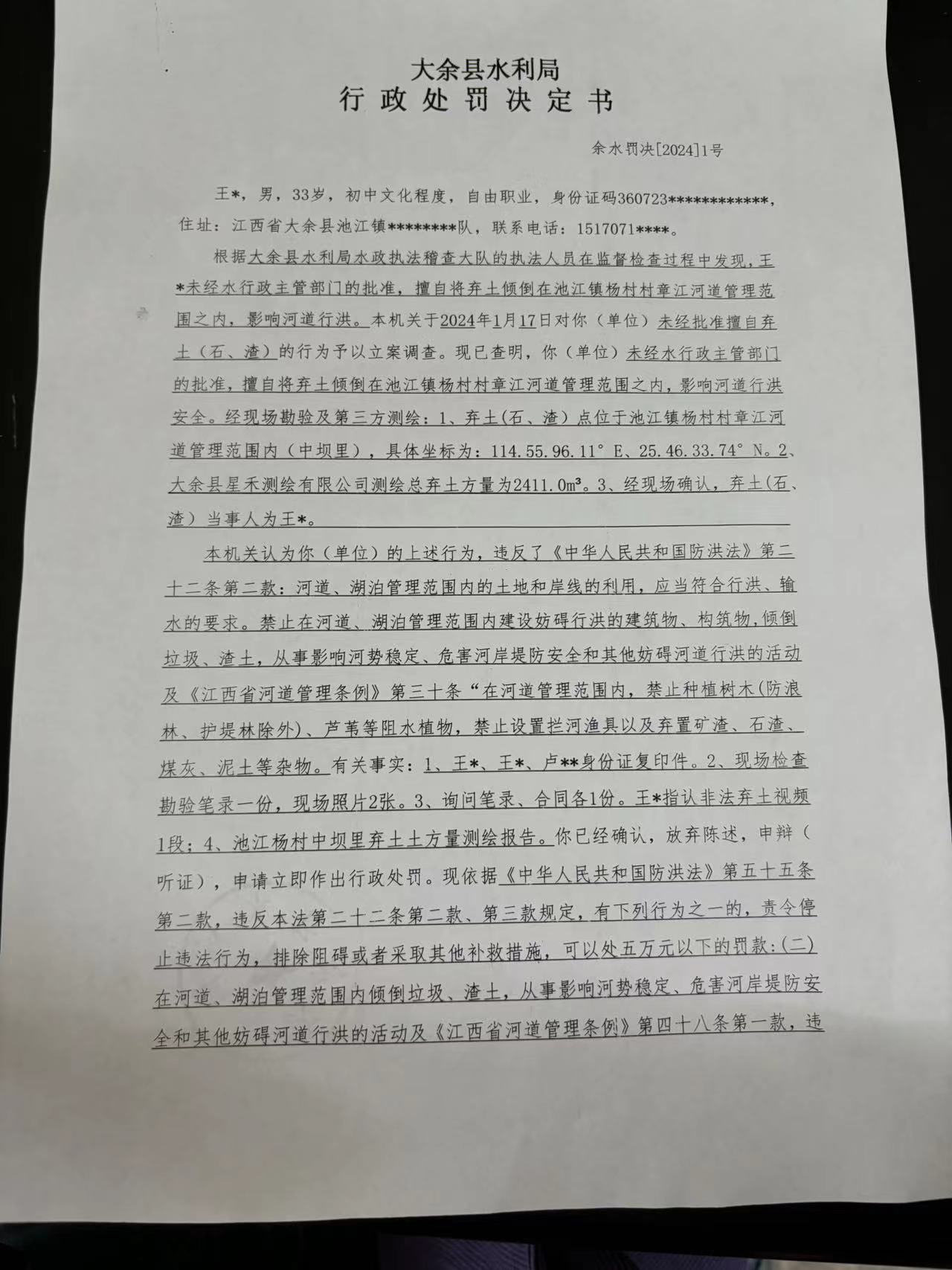 大余縣水利局行政處罰決定書余水罰訣【2024】1號