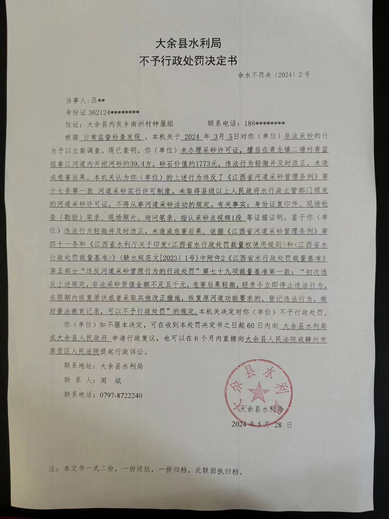 大余縣水利局不予行政處罰決定書余水不罰決【2024】2號