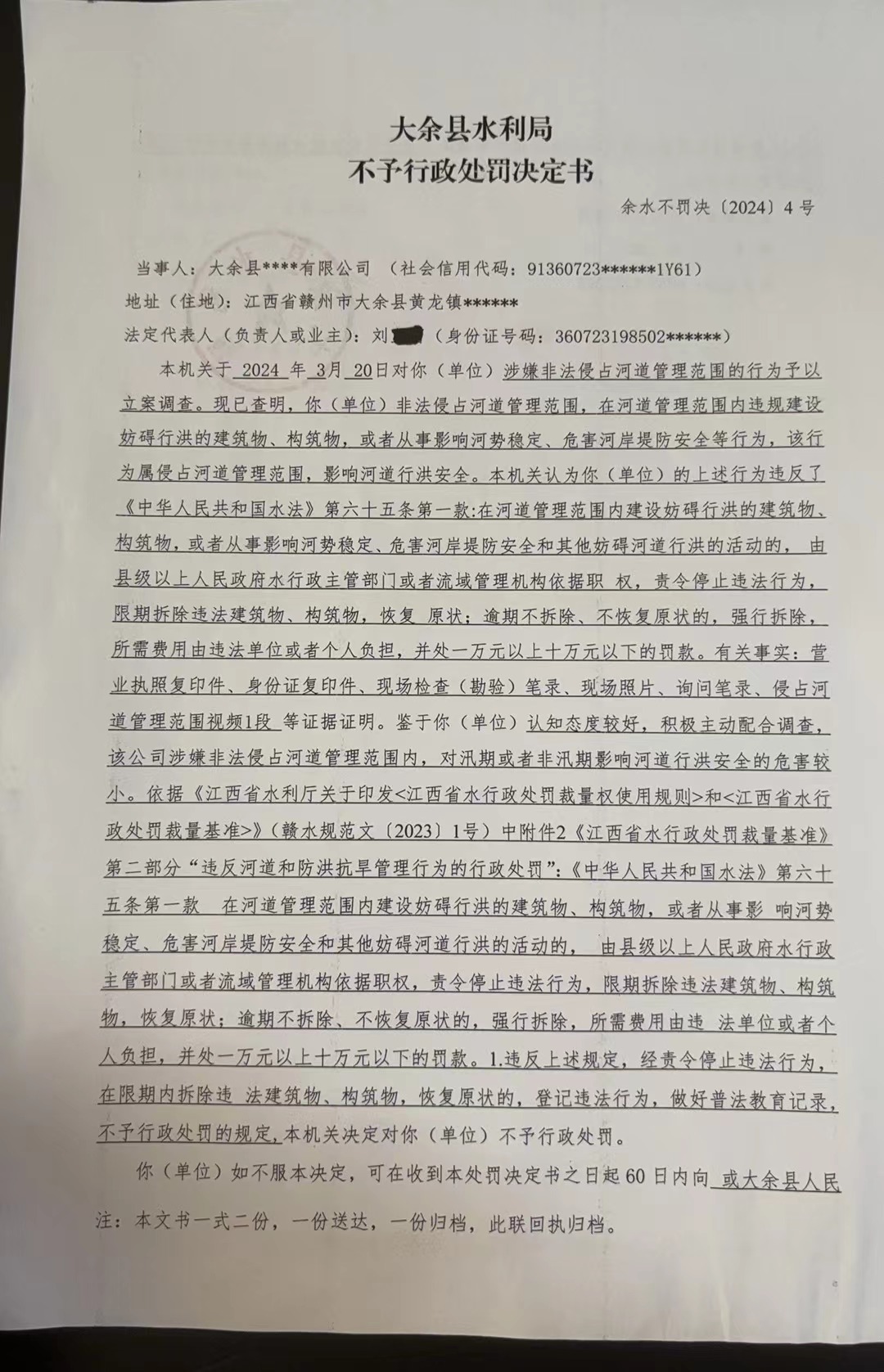 大余縣水利局不予行政處罰決定書 余水不罰訣【2024】4號