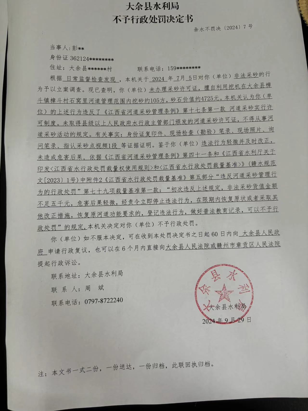 大余縣水利局不予行政處罰決定書 余水不罰決【2024】7號