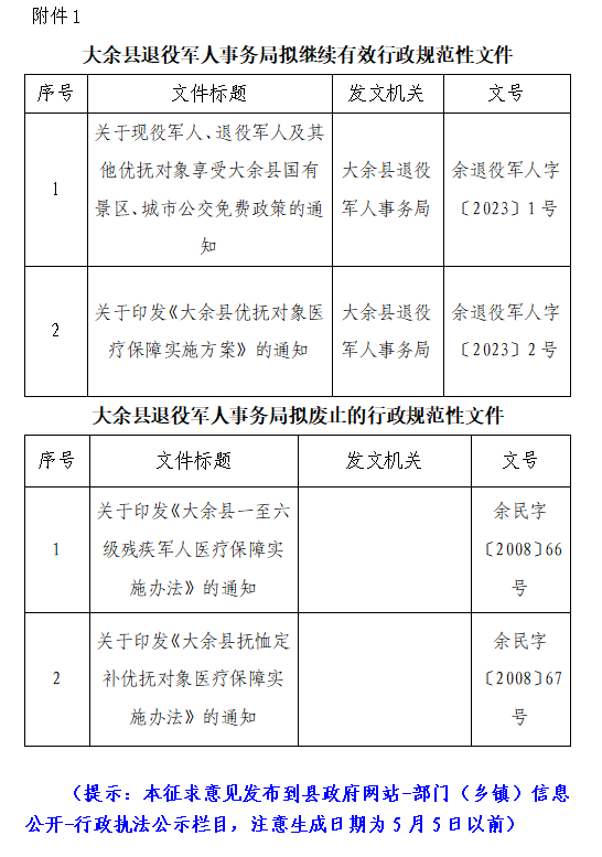 2.通過信函方式寄至:大余縣余西街建設(shè)路14號(hào)(縣退役軍人事務(wù)局)(郵政編碼341500),并在信封上注明“《關(guān)于公布大余縣退役軍人事務(wù)局行政規(guī)范性文件清理結(jié)果的通知(征求意見稿)》征求意見”字樣。