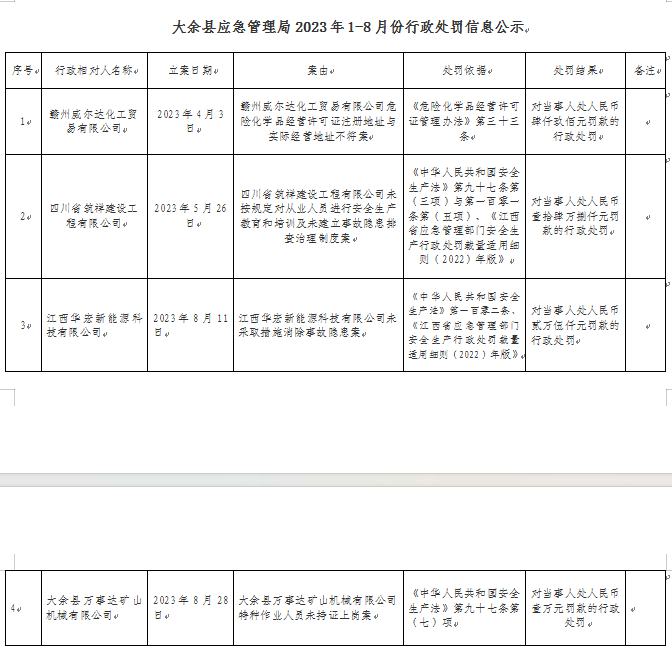 大余縣應急管理局2023年1-8月行政執(zhí)法公示