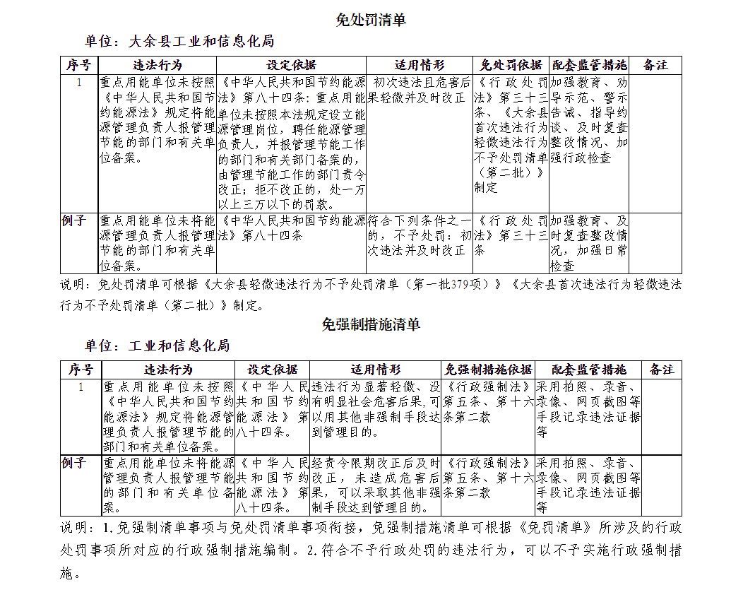 大余縣工信局行政執法減免責清單