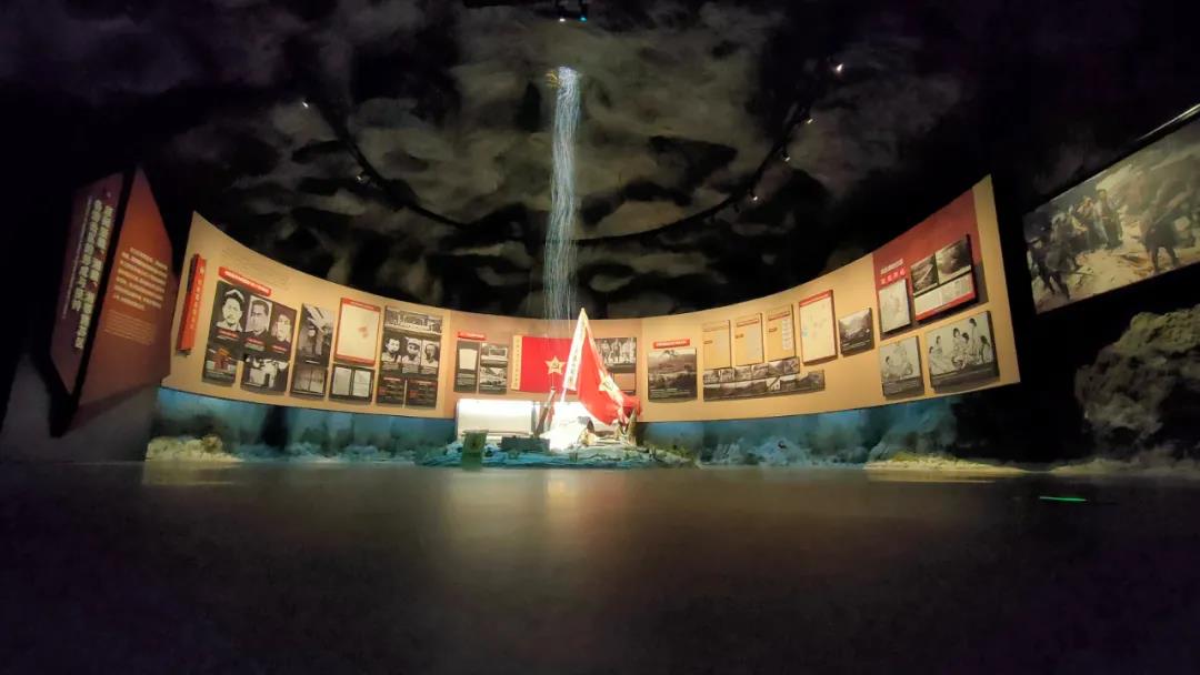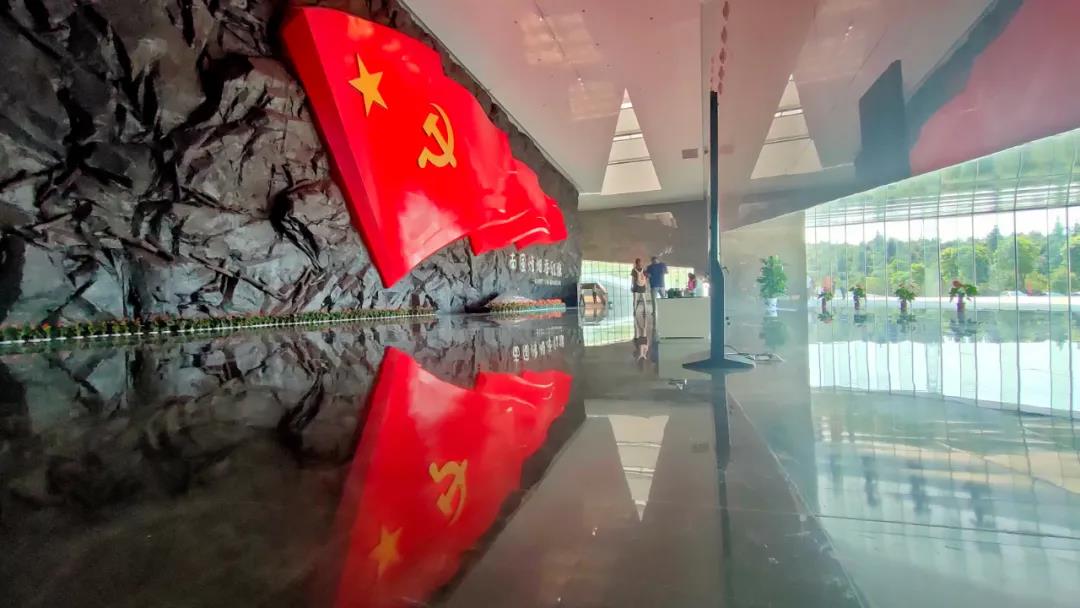在紀念館一樓序廳,設置了以中國工農紅軍軍旗為主雕塑的大型浮雕,巨型紅旗破山而出,迎風招展,高高飄揚,氣勢如虹;紅旗寬40米、高13米、面積520平方米,是目前中國革命史展館中室內面積最大的一面紅旗。這面紅旗是信念信仰的象征,是浴血堅持的象征,是不忘初心砥礪前行的象征,更是不斷從勝利走向勝利的象征。