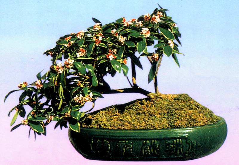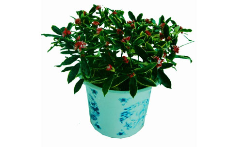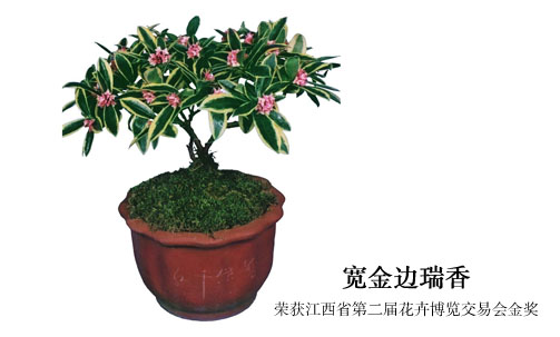 金邊瑞香(Daphne odihaby auroo margimata)是瑞香的變種,屬瑞香科瑞香屬常綠小灌木。肉質根系,葉片密集輪生橢園形,長約5~6cm,寬2~3cm,葉面光滑而厚,革質,兩面均無毛,表面深綠色,葉背淡綠色,葉緣金黃色,葉柄粗短,呈頂生頭狀花序,花被筒狀,上端四裂,徑約1.5cm,每簇花由數十朵小花組成,由外向內開放,花期二個多月,盛花期為春節期間,花色紫紅鮮艷,香味濃郁。 金邊瑞香原產長江流域,生長在低山丘陵陰蔽濕潤地帶。據宋代《清異錄》記載:廬山有一老和尚坐于廟后石凳上入定,迷夢中聞異香酷烈,欣然而起,便在四周芳草地中尋找,得濃葉香花一株,移植盆中,供于佛前,名之曰“睡香”,不久春節已至,花香不減,敬佛者益多,四方奇之,咸謂之老佛所賜,乃一年祥瑞之兆,遂改名瑞香。此后,采種者日益增多,經過漫長歲月的人工蒔養栽培馴化,并從瑞香花產生芽變的親品種中,篩選出了葉緣鑲金邊的金邊瑞香。