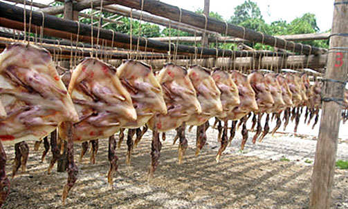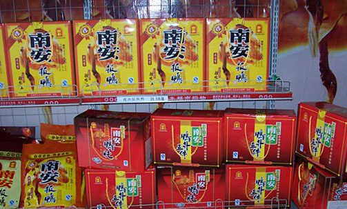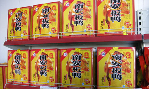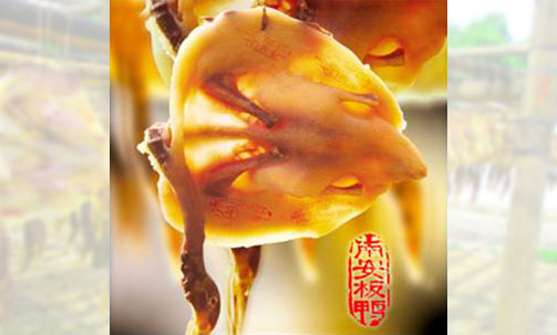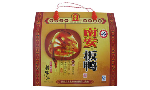 中華老字號產品,江西省地方名優(yōu)產品。南安板鴨在清朝時已是朝廷貢品,距今已有400多年歷史。其外形美觀,皮薄肉嫩,尾油豐滿,骨脆可嚼,味香可口,素有“臘中之王”的美稱。