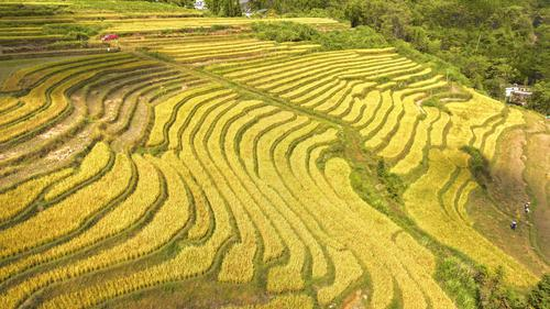近日,河洞鄉長嶺村高山梯田水稻陸續成熟,金黃稻浪在層層梯田上勾勒出優美曲線,一派豐收景象。(大余縣融媒體中心 彭青蕓)