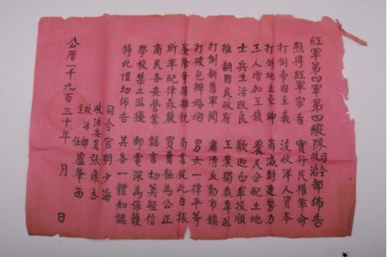布告為紅色機(jī)制紙,石版印刷、楷體、黑字、豎排。首行為標(biāo)題“紅軍第四軍第四縱隊(duì)司令部、政治部布告”。落款“司令官胡少海、政治委員張鼎丞、政治部主任盧肇西”“公歷一千九百三十年”。主體部分共26行、156字,以六言詩形式詳述紅軍宗旨,號召“一體知認(rèn)”。年月上加蓋“紅軍第四軍第四縱隊(duì)司令部” 篆體陽文圓形印章。這是古田會(huì)議以后,蘇區(qū)所見的第一張宣傳我黨我軍宗旨的大型布告,是一張品相完好的珍貴蘇區(qū)紅色文物原件。它概括了中國共產(chǎn)黨和人民軍隊(duì)堅(jiān)決打倒國民黨反動(dòng)派,解放勞苦大眾的一貫主張,表明了對于建立新的社會(huì)制度和各種政策和安定民心的具體措施。這張布告曾在贛南閩西人民中間產(chǎn)生了巨大影響,對中央蘇區(qū)的創(chuàng)建起了積極作用,激勵(lì)了廣大貧苦大眾。隨著時(shí)間的推移,這張布告作為這段紅色革命歲月的見證者,見證了紅四軍與反動(dòng)派進(jìn)行生死搏斗的革命史跡。
