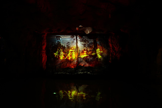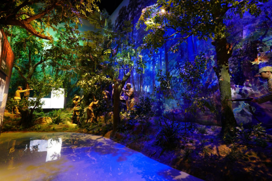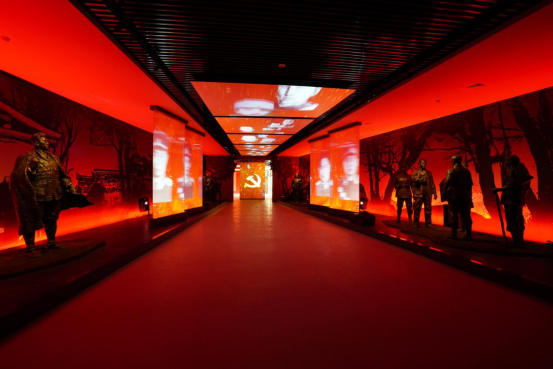 巧用空間。實現(xiàn)了建筑空間和陳列形式的完美結(jié)合。展廳三層貫通,整體通暢,利用10米通高,構(gòu)筑由下至上、從上而下多向、多層級、多視角的全新觀展空間。觀眾在開放、曲折跌宕的空間內(nèi)行進,不斷與展陳內(nèi)容形成視聽上的沖擊和心靈上的共鳴。序廳17米高,正面設計的是一面中國工農(nóng)紅軍軍旗,紅旗寬40米、高13米,面積為520平方米,是目前全國革命歷史題材展館中面積最大的紅旗,象征著紅軍游擊隊在黨的領導下,始終高舉紅旗、不屈不撓、向死而生的英雄主義。展覽內(nèi)容鋪陳在三層空間中,這就存在觀展轉(zhuǎn)換空間(上樓),為了避免觀眾在上一個情景營造的氛圍中因轉(zhuǎn)換而“出戲”,設計了兩條高峻狹窄的連接坡道,用時間軸將過度空間打造成時空隧道,觀眾在觀展時從一個故事穿越到下一個故事,仿佛時空穿越,體驗感極其強烈。